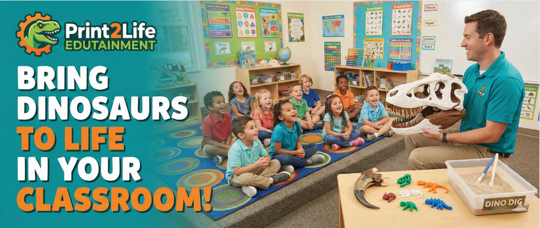 Print2Life Edutainment brings museum-style dinosaur learning directly to your classroom. Our programs are designed for: