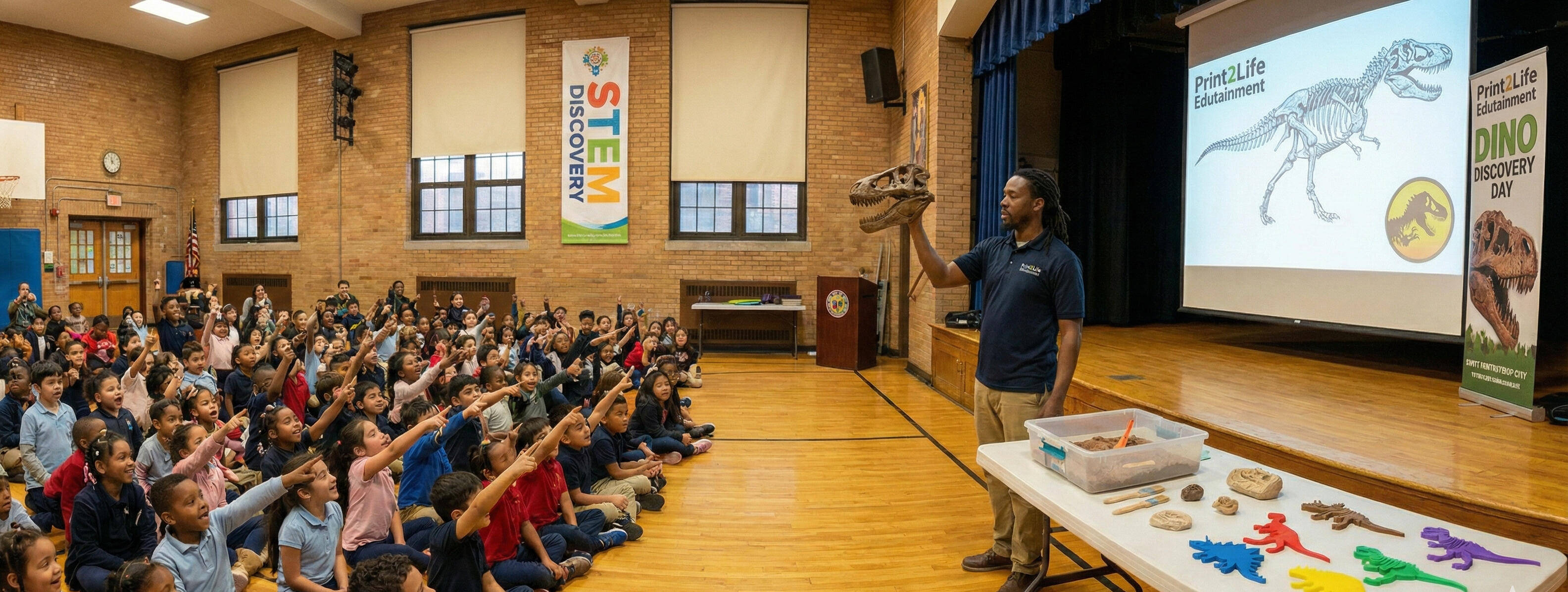 Print2Life Edutainment brings museum-style dinosaur learning directly to your classroom. Our programs are designed for: